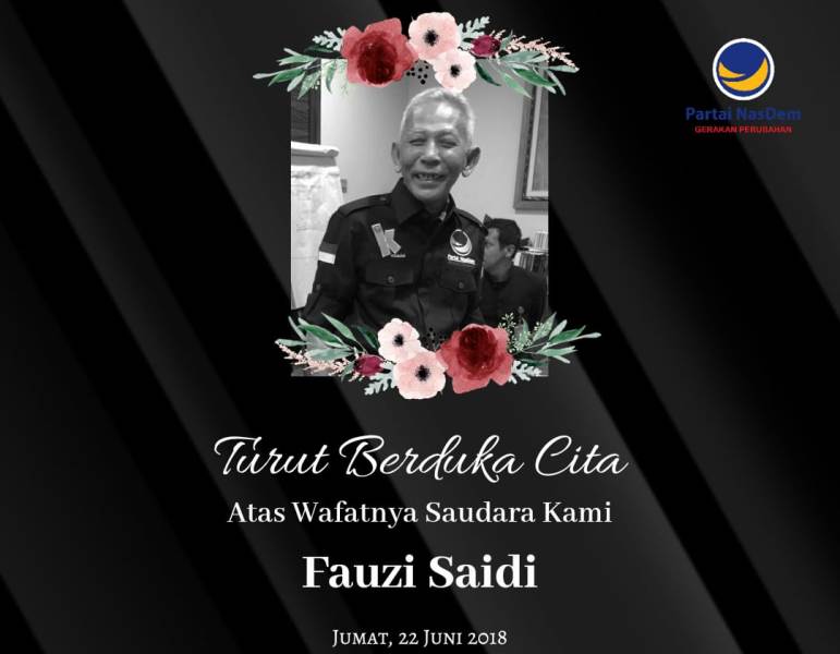 JAKARTA (23 Juni): Kelurga Besar Partai NasDem kehilangan salah seorang kader terbaiknya. Telah berpulang ke Rahmatullah, Fauzi Said bin A Saidi di RS Puri Indah, Jakarta Selatan, Jumat, 22 Juni, pukul 23.50 WIB, akibat serangan jantung.