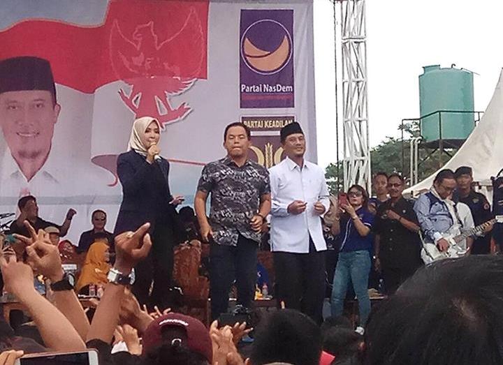 BENGKULU, (24 Juni): Pasangan Calon Wali Kota nomor urut 2 yang diusung Partai NasDem, Erna Sari Dewi-Ahmad Zarkasih (ESD-AZA) menggelar kampanye akbar di Sport Center, Pantai Pajang, Bengkulu, Sabtu, (23/6).