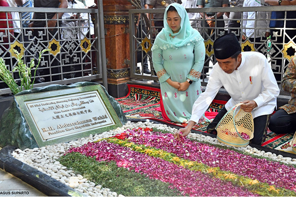 PRESIDEN Joko Widodo berziarah ke makam Presiden ke-4 RI Abdurrahman Wahid alias Gus Dur dalam kunjungan ke Pondok Pesantren (Ponpes) Tebuireng, Jombang, Jawa Timur.