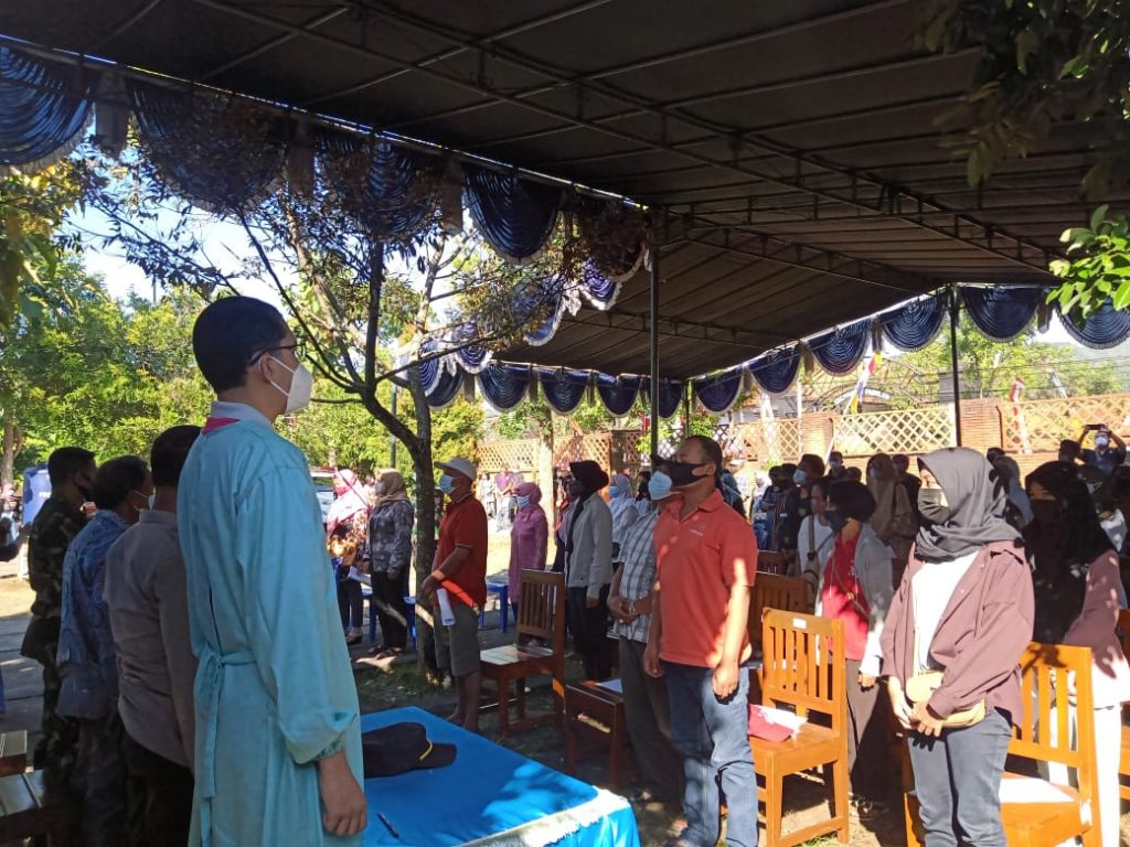 Sebelum menjalani vaksinasi, masyarakat diajak bersama-sama berdiri dengan hidmat untuk menyanyikan lagu kebangsaan Indoensia Raya. Kegiatan dipandu oleh Tenaga Ahli Kak Fadholi, Kak Ponimah. Para peserta vaksin pun penuh semangat menyanyikan lagu Indonesia Raya dengan tetap memakai masker dan berjaga jarak.