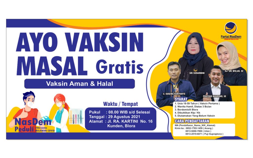 “Kuota vaksin sebanyak 250 dosis untuk hari Minggu besok dengan sasaran simpatisan NasDem di wilayah Kecamatan Blora Kota dan masyarakat umum tentunya,” ujar Kak Sugeng lewat pesan WhatsApp.
