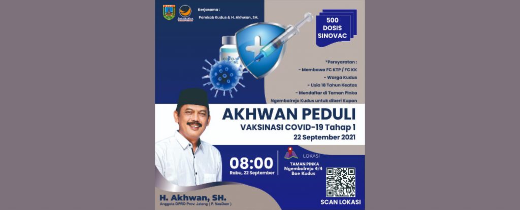 JATENG.NASDEM.ID – Anggota DPRD Provinsi Jawa Tengah Fraksi Partai NasDem Kak Akhwan akan menggelar vaksinasi massal untuk masyarakat Kudus pada Rabu besok. Hal ini dikonfirmasi oleh Tenaga Ahli Kak Akhwan yaitu Kak Saiful Bachri.
