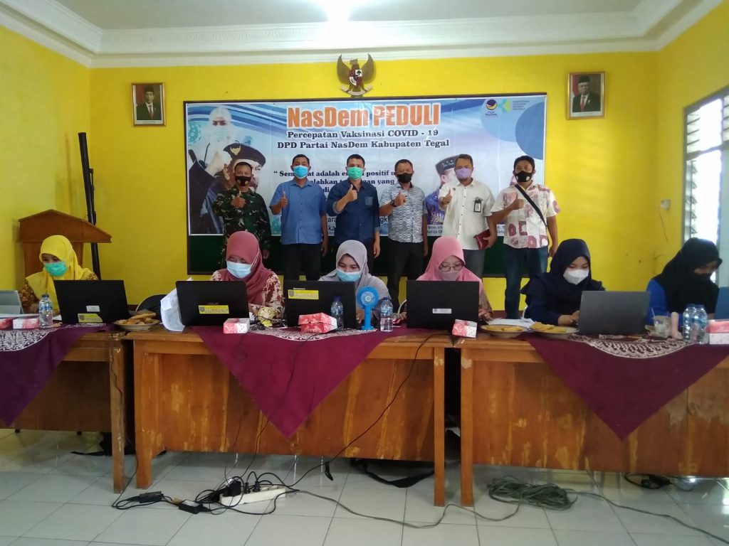DPD Partai NasDem Kabupaten Tegal bekerja sama dengan Pemerintah Desa Pedagangan, Kecamatan Dukuhwaru, dan Puskesmas Dukuhwaru, menyelenggarakan kegiatan vaksinasi NasDem Peduli dengan menyediakan 222 Dosis vaksin Sinovac