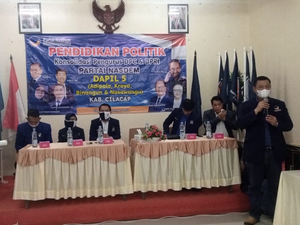 NASDEM.JATENG.ID – Pendidikan Politik (Dikpol) dan konsolidasi pengurus DPC dan DPRt di Wilayah DPD Partai Nasdem Cilacap terakhir berlangsung di Dapil 5 meliputi kecamatan Adipala, Binangun, Kroya, Nusawungu. Acara berlangsung di Rumah makan Mbak Rum, Pekuncen Kroya, Cilacap, Sabtu (17/10).