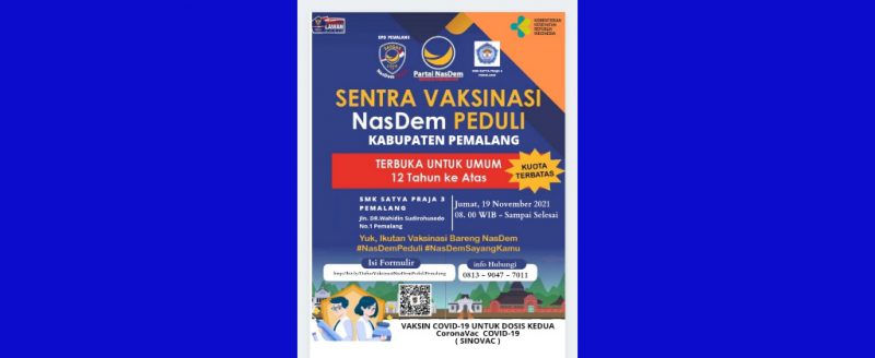 “Vaksinasi NasDem dosis kedua dilaksanakan di SMK Satya Praja 3 depan Kantor NasDem Pemalang. Persiapan kami hampir sempurna, nanti sore kami akan setting tempat karena lokasi masih digunakan untuk sekolah tatap muka,” kata Ketua DPD NasDem Pemalang Kak Suwarno, Kamis (18/11) siang.