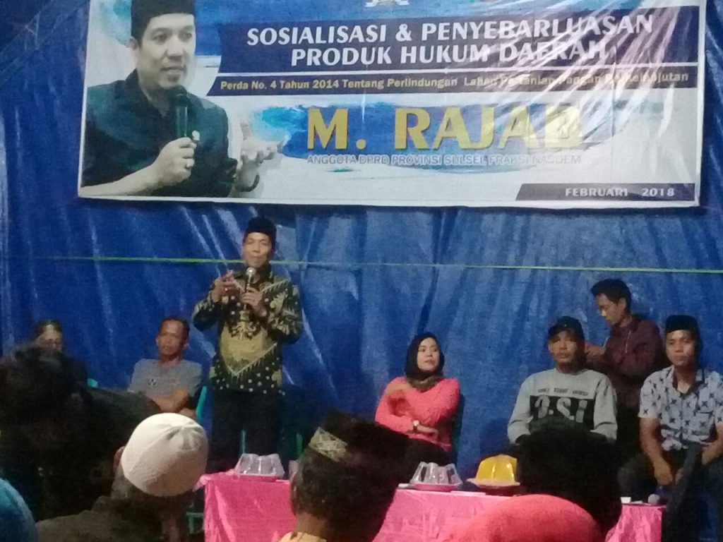 LUWU UTARA, (24 Februari): Legislator DPRD Sulawesi Selatan dari Fraksi NasDem, M Rajab melakukan sosialisasi dan penyebarluasan produk hukum daerah Perda nomor 4/2014 Tentang Perlindungan Lahan Pertanian Pangan Berkelanjutan di Desa Sepakat Kecamatan Mappideceng Kabupaten Luwu Utara, Sulawesi Selatan (Sulsel), Jumat (23/2).