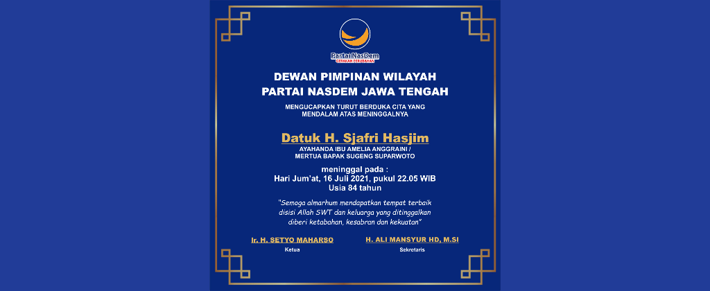 Atas wafatnya Bapak Sjafri Hasjim tersebut, keluarga besar Media Center NasDem Jateng menyampaikan dukacita yang mendalam semoga almarhum husnul khotimah, diampuni semua dosa-dosanya dan diberi tempat yang mulia di sisi Tuhan.