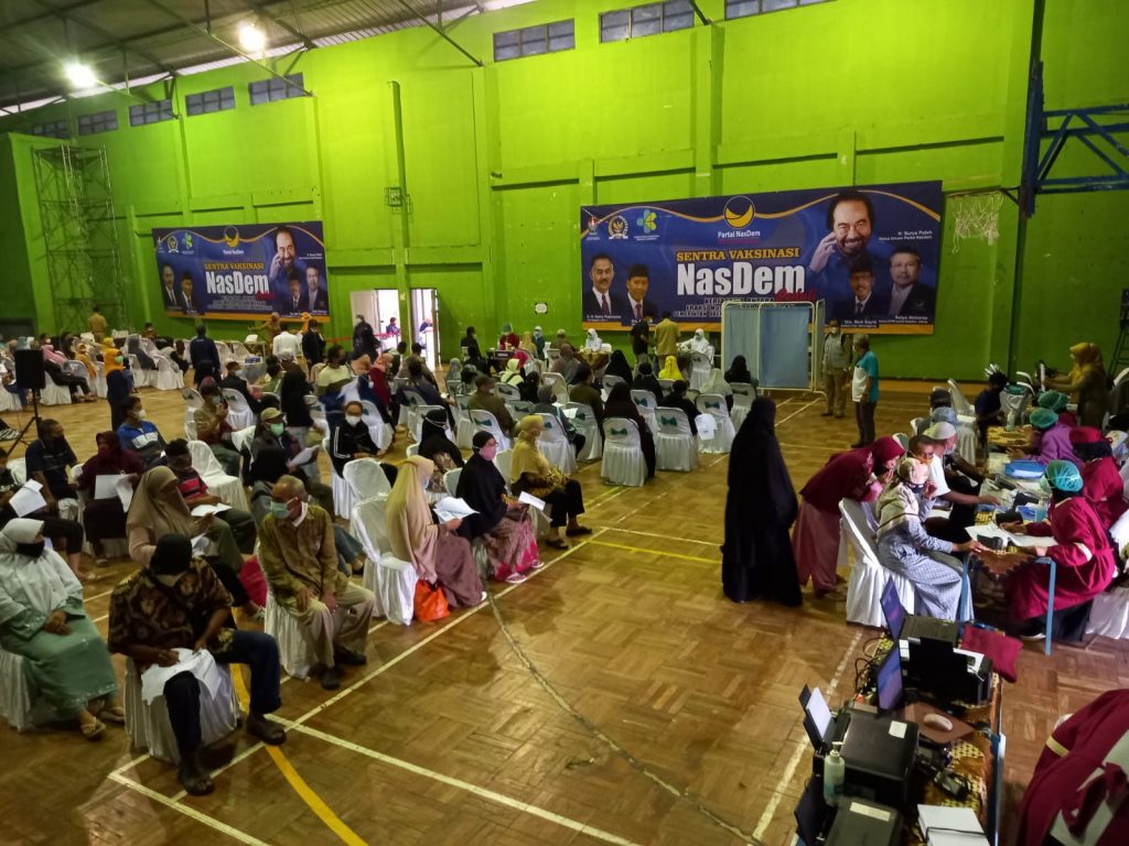JATENG.NASDEM.ID – Lokasi vaksinasi terasa longgar bagi para peserta karena daya tampung besar, maklum kegiatan digelar di GOR Bambu Runcing, Temanggung. Deretan kursi dibungkus kain putih mengingatkan pada sebuah acara pesta.
