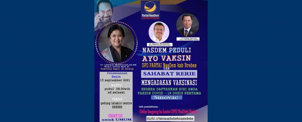 JATENG.NASDEM.ID – DPD NasDem Kabupaten Brebes menggelar vaksinasi massal bagi masyarakat. Sebanyak 1.000 dosis vaksin Covid-19 akan disuntikkan kepada warga. Kegiatan ini mendapat apresiasi Polres Brebes yang hadir meninjau vaksinasi yang digelar di Gedung Islamic Center Kabupaten Brebes, Senin (13/09) …
