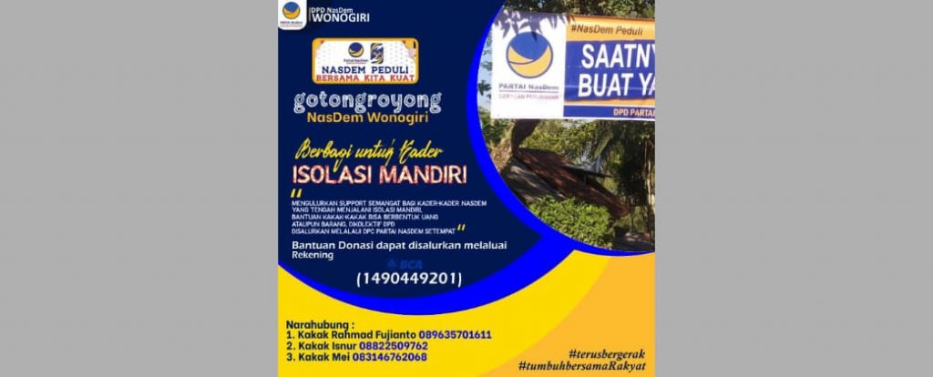 JATENG.NASDEM.ID – Kader NasDem Milenial Wonogiri bagai tak hirau soal waktu. Dengan menumpang mobil pikap milik Partai NasDem Wonogiri, NasDem milenial mengirimkan lima paket sembako untuk warga isolasi mandiri (isoman) program Gotong Royong NasDem Wonogiri, Kamis (29/7). Koordinator NasDem Wonogiri …